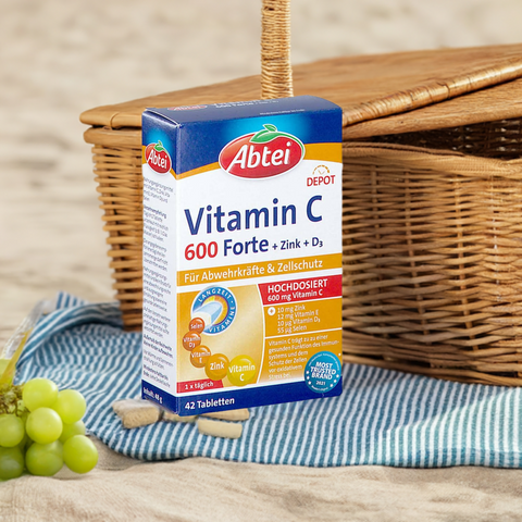 Abtei Vitamin C 600 Forte + Zink + D3 ist eine wirkungsvolle Kombination zur gezielten Unterstützung der körpereigenen Abwehrkräfte und zum Schutz der Zellen vor oxidativem Stress. Mit 600 mg hochdosiertem Vitamin C, ergänzt durch Zink und Vitamin D3, bietet dieses Produkt eine umfassende Nährstoffversorgung – ideal für die kalte Jahreszeit, bei starker Belastung oder zur täglichen Immunpflege.
