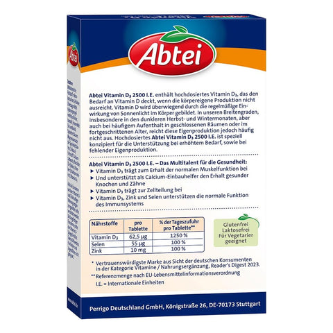 Abtei Vitamin D3 2500 I.E. + Zink + Selen ist ein leistungsstarkes Nahrungsergänzungsmittel zur gezielten Unterstützung von Immunsystem, Knochengesundheit und Muskelfunktion – besonders in den sonnenarmen Monaten oder bei erhöhtem Bedarf. Mit 62,5 µg hochdosiertem Vitamin D3 pro Tablette bietet dieses Produkt eine zuverlässige Versorgung mit dem „Sonnenvitamin“, das der Körper oft nicht ausreichend über die Haut bildet.