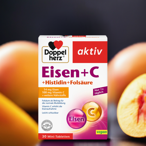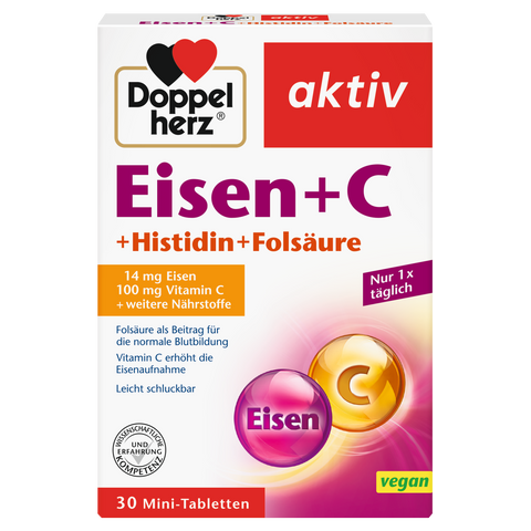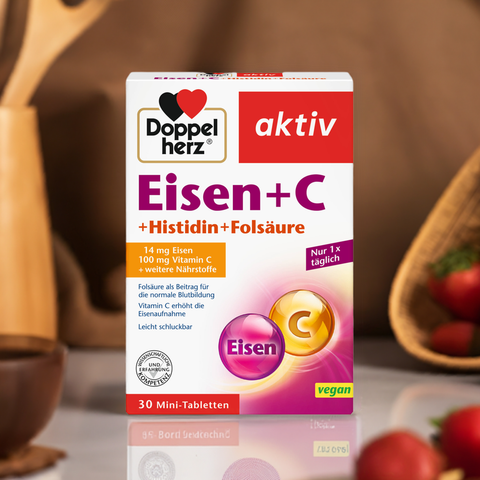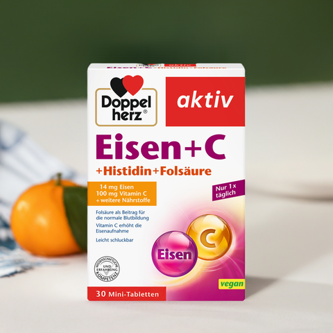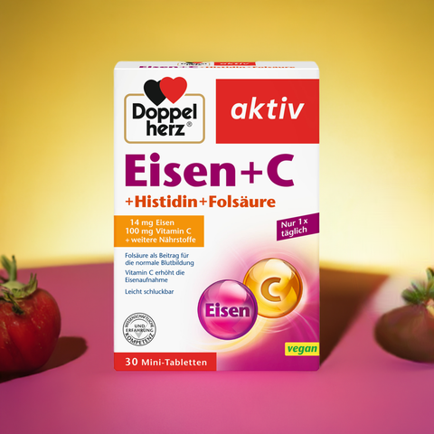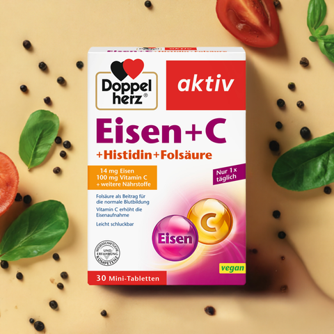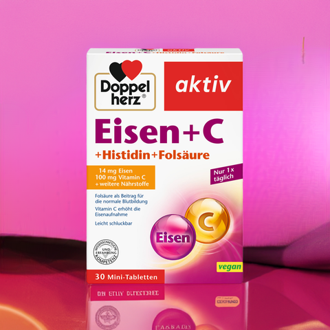 Doppelherz aktiv Eisen + C + Histidin + Folsäure Mini-Tabletten bieten eine gezielte Nährstoffversorgung zur Unterstützung der normalen Blutbildung und des Immunsystems. Mit einer Kombination aus 14 mg Eisen, 100 mg Vitamin C, Histidin und Folsäure tragen diese Tabletten dazu bei, den täglichen Bedarf an wichtigen Mikronährstoffen optimal zu decken. Besonders in Phasen erhöhten Bedarfs, wie bei einseitiger Ernährung, erhöhter körperlicher Belastung oder während der Schwangerschaft, kann eine ausreichende Versorgung mit Eisen und Folsäure entscheidend sein.
