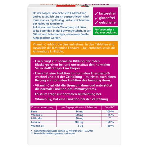 - Enthält 14 mg Eisen und 100 mg Vitamin C pro Tablette
