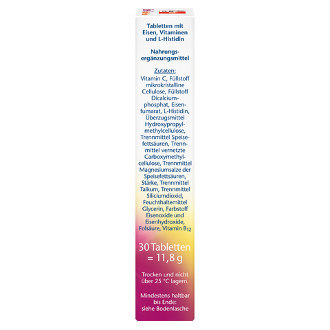 Eisen trägt zur normalen Bildung roter Blutkörperchen und Hämoglobin sowie zur Verringerung von Müdigkeit bei. Vitamin C verbessert die Eisenaufnahme und unterstützt zusätzlich das Immunsystem. Die enthaltene Folsäure ist unverzichtbar für die Zellteilung und die Blutbildung. Histidin, eine proteinogene Aminosäure, rundet die durchdachte Rezeptur sinnvoll ab.