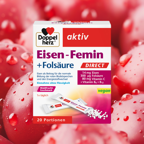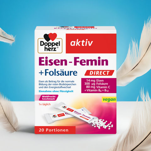 Doppelherz aktiv Eisen-Femin + Folsäure Direct wurde speziell für Frauen entwickelt, um die Versorgung mit wichtigen Nährstoffen für Blutbildung, Energiehaushalt und Immunsystem optimal zu unterstützen. Die innovative Direct-Form bietet eine schnelle und praktische Einnahmemöglichkeit ohne Wasser – ideal für unterwegs oder den hektischen Alltag.