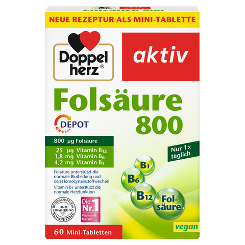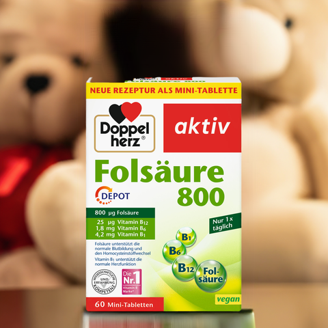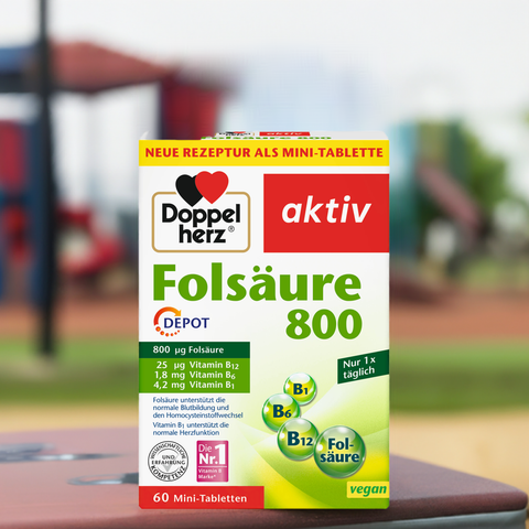 Doppelherz aktiv Folsäure 800 DEPOT bietet eine hochwertige Kombination aus essentiellen B-Vitaminen in praktischer Mini-Tabletten-Form. Mit 800 µg Folsäure pro Tablette trägt das Produkt entscheidend zur normalen Blutbildung und zum gesunden Homocystein-Stoffwechsel bei. Ergänzt wird die Rezeptur durch 25 µg Vitamin B12, 1,8 mg Vitamin B6 und 4,2 mg Vitamin B1, die den Energiestoffwechsel, das Nervensystem sowie die Herzfunktion unterstützen.