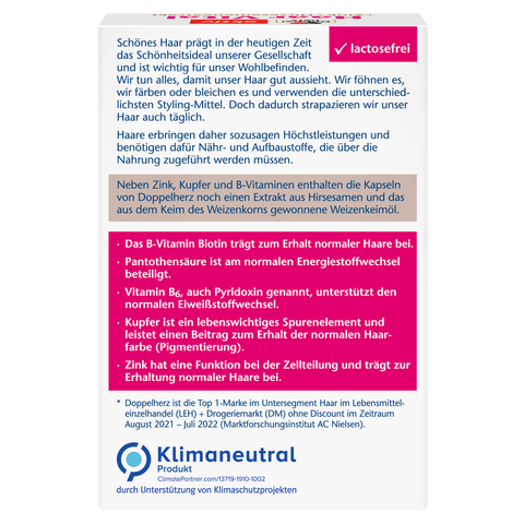 Doppelherz aktiv Haar Vital wurde speziell entwickelt, um die Gesundheit und Vitalität Ihrer Haare von innen heraus zu unterstützen. Die innovative Rezeptur kombiniert wichtige Mikronährstoffe wie Biotin, Zink, Kupfer und Vitamin B6 mit natürlichen Extrakten wie Hirsesamen und hochwertigem Weizenkeimöl. Diese synergetische Zusammensetzung versorgt Ihre Haarwurzeln mit wertvollen Nährstoffen, fördert das Haarwachstum und unterstützt die Erhaltung der Haarstruktur.