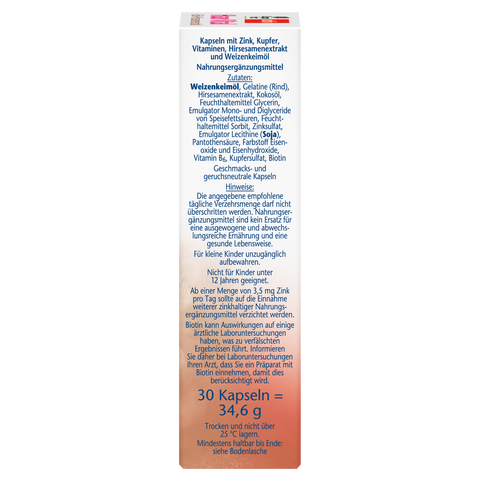 Mit 300 µg Biotin pro Kapsel trägt dieses Nahrungsergänzungsmittel effektiv zur Erhaltung normaler Haare bei. Zink stärkt zusätzlich das Haar und unterstützt eine gesunde Zellteilung. Kupfer ist ein Schlüsselfaktor für die normale Pigmentierung der Haare und hilft, Farbverlust vorzubeugen. Panthothensäure (Vitamin B5) und Vitamin B6 fördern den Energiestoffwechsel, was für eine optimale Zellversorgung essenziell ist - besonders in Zeiten von Stress oder hormonellen Veränderungen, die das Haar belasten können.