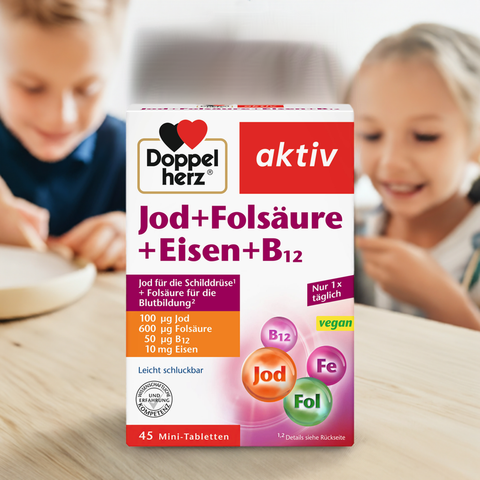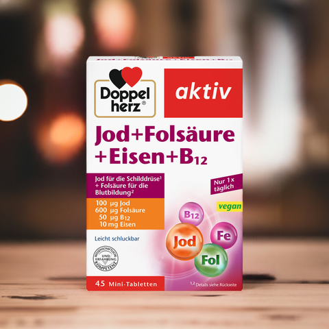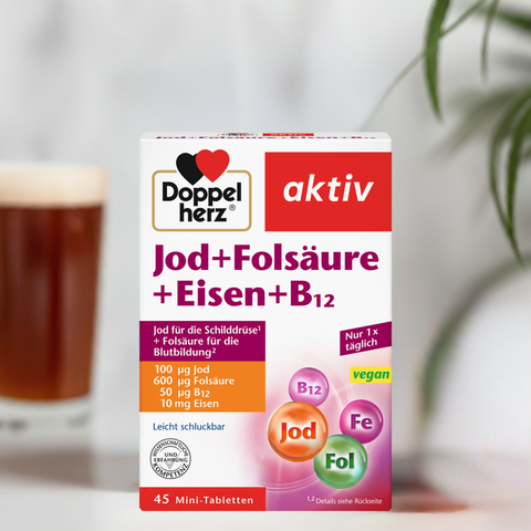 Doppelherz aktiv Jod + Folsäure + Eisen + B12 ist ein speziell entwickeltes Nahrungsergänzungsmittel, das vier lebenswichtige Mikronährstoffe in optimal abgestimmter Dosierung kombiniert. Diese vegane Formel wurde konzipiert, um die normale Funktion der Schilddrüse, die Blutbildung sowie das allgemeine Energielevel effektiv zu unterstützen - ideal für Personen mit erhöhtem Nährstoffbedarf, wie Schwangere, Stillende, Vegetarier oder Menschen mit unausgewogener Ernährung.