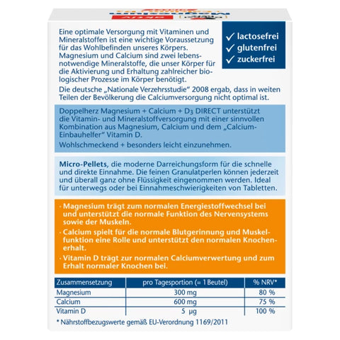 Doppelherz aktiv Magnesium + Calcium + D3 DIRECT ist die praktische Lösung für alle, die ihre Muskelfunktion und Knochengesundheit gezielt unterstützen möchten - ganz ohne Wasser. Die innovative Darreichungsform als Direktgranulat in Portionssticks erlaubt die Einnahme jederzeit und überall. Mit frischem Zitronengeschmack und fein abgestimmter Nährstoffkombination ist dieses Produkt besonders alltagstauglich und angenehm in der Anwendung.
