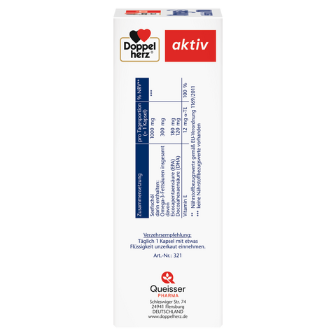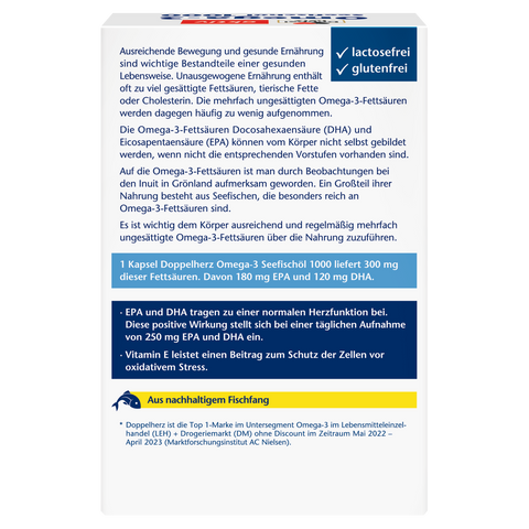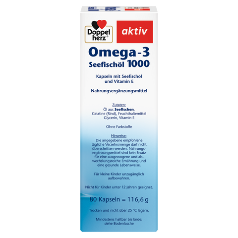Die Omega-3-Fettsäuren EPA und DHA sind für viele lebenswichtige Körperfunktionen relevant, insbesondere für das Herz-Kreislauf-System. Sie tragen zur Regulierung der Blutfettwerte bei und fördern die Fließfähigkeit des Blutes - entscheidend für eine gesunde Herzfunktion und Durchblutung. Doppelherz verwendet reines Seefischöl, das auf Schwermetalle kontrolliert und hochwertig verarbeitet ist.