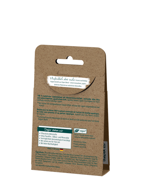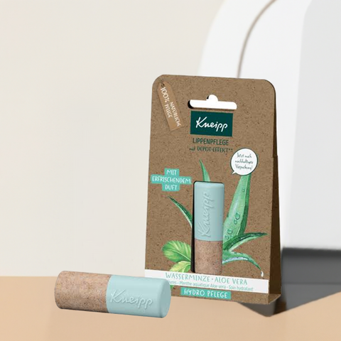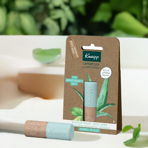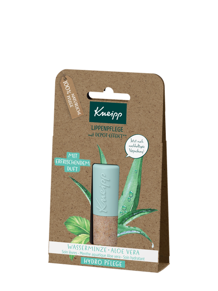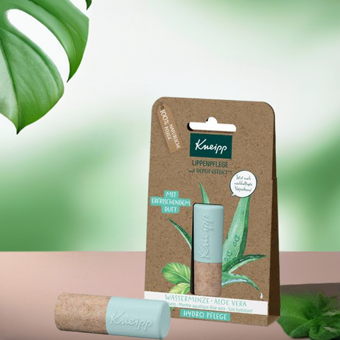 Die Kneipp Lippenpflege mit Wasserminze und Aloe Vera bietet intensive Feuchtigkeitspflege mit erfrischendem Duft - ganz natürlich und nachhaltig. Die innovative Formel mit Depot-Effekt versorgt Ihre Lippen langanhaltend mit Feuchtigkeit und schützt sie zuverlässig vor dem Austrocknen. Aloe Vera beruhigt und regeneriert, während Wasserminze mit ihrem kühlenden Aroma einen angenehm belebenden Pflegeeffekt entfaltet.