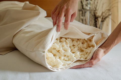 Die Füllung besteht aus Naturkautschukflocken. Durch Entnahme oder Zugabe von Füllmaterial kann man die ideale Höhe des Kissens für sich selbst bestimmen. Das Kissen hat eine Größe von 35 x 140 cm – andere Größen bitte unter wolena@wolena.at anfragen.